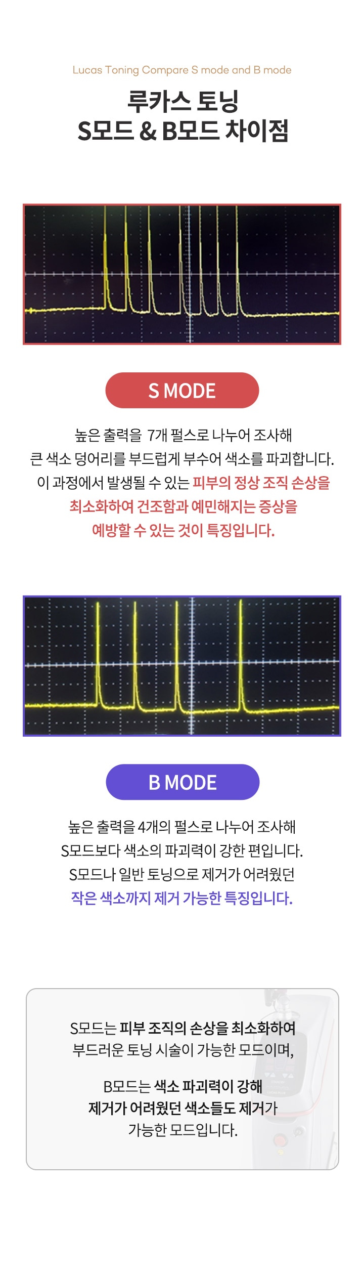 루카스 레이저 토닝은 기존 토닝과 다르게 한 개의 펄스 형태가 아닌 S모드를 이용하여